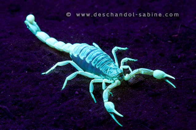: Scorpion ibérique (Buthus ibericus), spécimen sous rayons ultraviolets, Bordeira, Portugal.