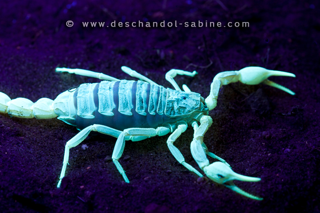 : Scorpion ibérique (Buthus ibericus), spécimen sous rayons ultraviolets, Bordeira, Portugal.