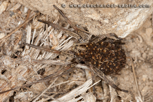 : Araignée-loup (Hogna radiata), femelle et ses jeunes, La Franqui (11), France.
