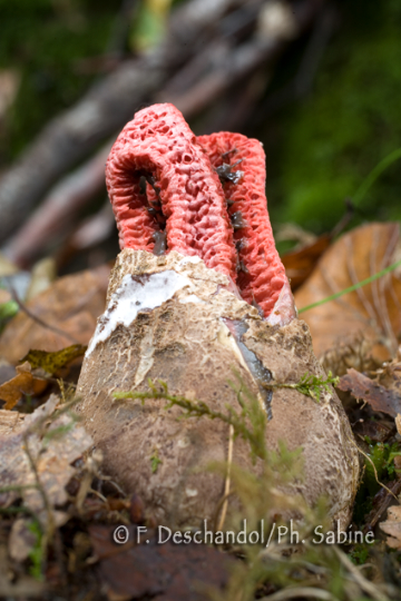 : Clathrus d'Archer (Clathrus archeri), éclosion de l'"oeuf", Forêt de Brotonne (76), France.