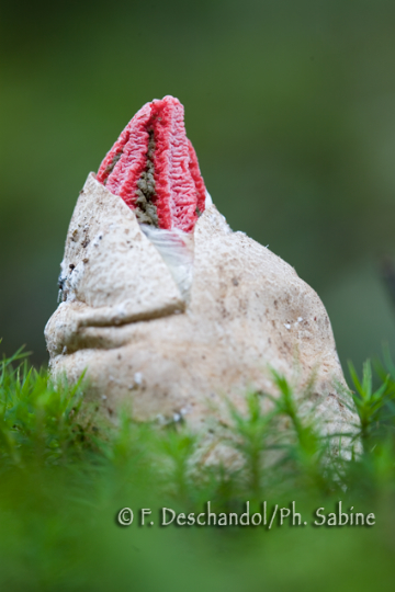 : Clathrus d'Archer (Clathrus archeri), éclosion de l'"oeuf", Forêt de Brotonne (76), France.