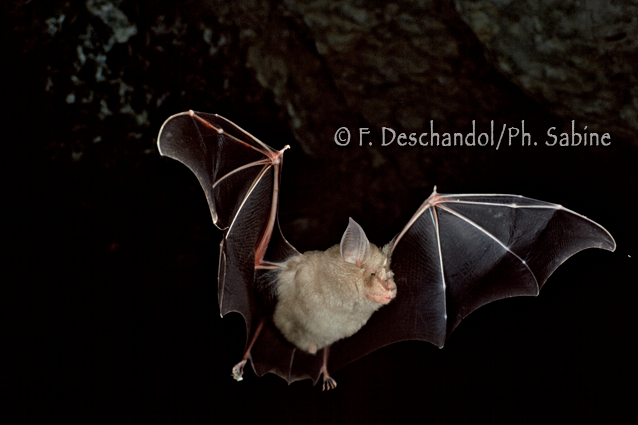 : Grand rhinolophe (Rhinolophus ferrumequinum), en vol, Normandie, France.
