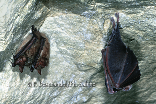 : Vespertilions à oreilles échancrées (Myotis emarginatus) et Grand rhinolophe (Rhinolophus ferrumequinum), Normandie, France.