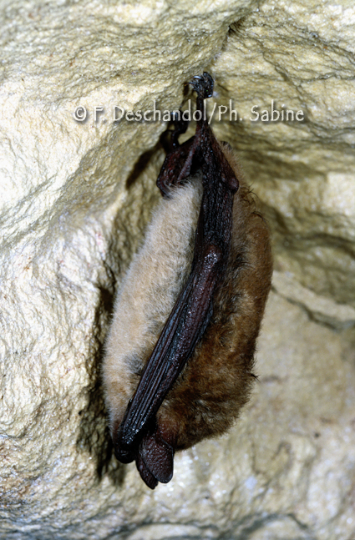 : Vespertilion à oreilles échancrées (Myotis emarginatus), Normandie, France.