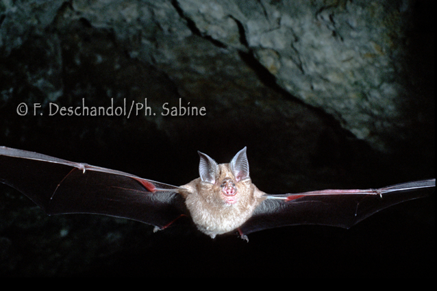 : Grand rhinolophe (Rhinolophus ferrumequinum), en vol, Normandie, France.