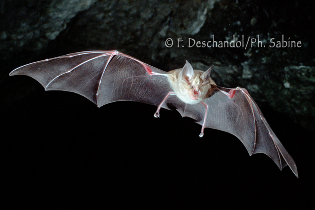 : Grand rhinolophe (Rhinolophus ferrumequinum), en vol, Normandie, France.