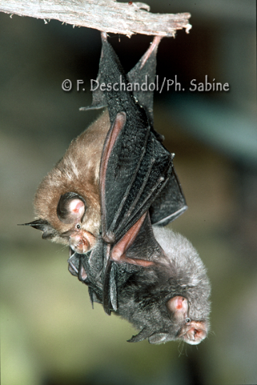 : Petits rhinolophes (Rhinolophus hipposideros), adulte et son jeune, Tarn et Garonne (82), France.