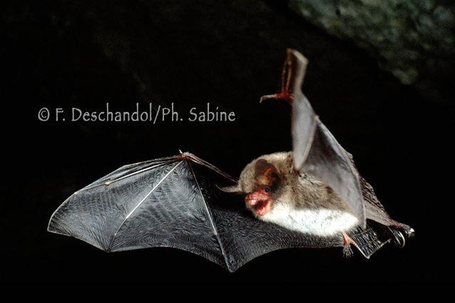 : Vespertilion de Natterer (Myotis nattereri), en vol, Normandie, France.