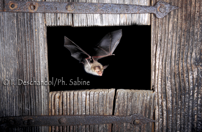 : Vespertilion de Natterer (Myotis nattereri), en vol, Normandie, France.