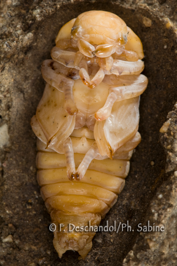 : Lucane cerf-volant (Lucanus cervus), nymphe femelle dans sa loge, Nantes (44), France.
