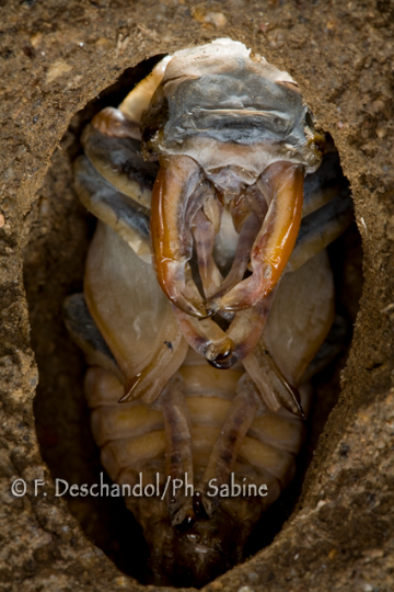 : Lucane cerf-volant (Lucanus cervus), nymphe mâle dans sa loge, Nantes (44), France.