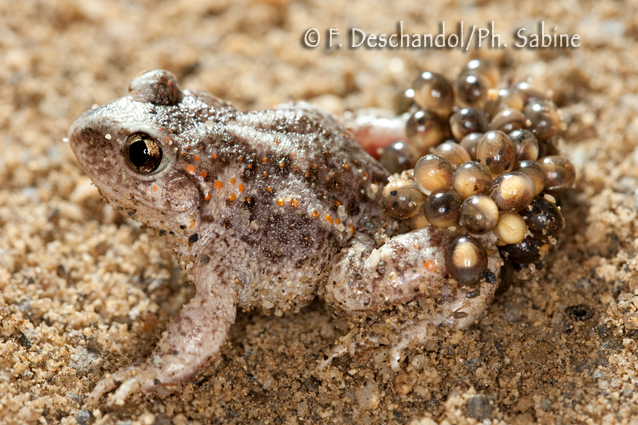 : Alyte accoucheur (Alytes obstetricans boscai), mâle avec oeufs, Cional, Espagne.