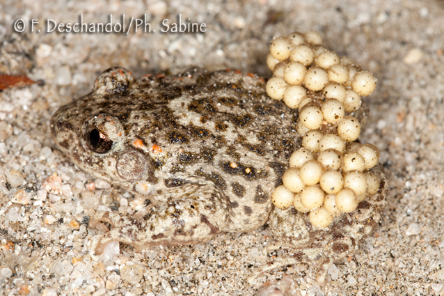 : Alyte accoucheur (Alytes obstetricans boscai), mâle avec oeufs, Fondevila, Espagne.