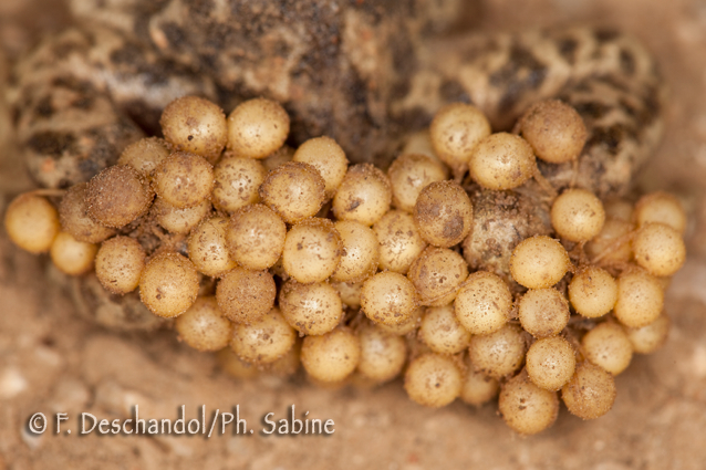 : Alyte accoucheur (Alytes obstetricans pertinax), oeufs, Vallée d'Embid, Espagne.