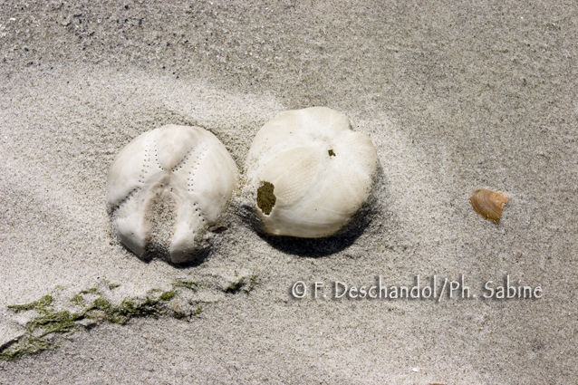 : Oursins des sables (Echinocardium cordatum), tests, Ile de Schiermonnikoog, Pays-Bas.