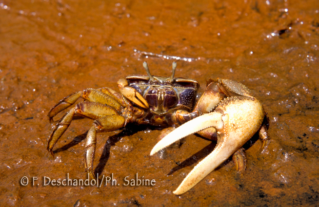 : Crabe violoniste (Uca tangeri), mâle, Marisma del Odiel, Huelva, Espagne.