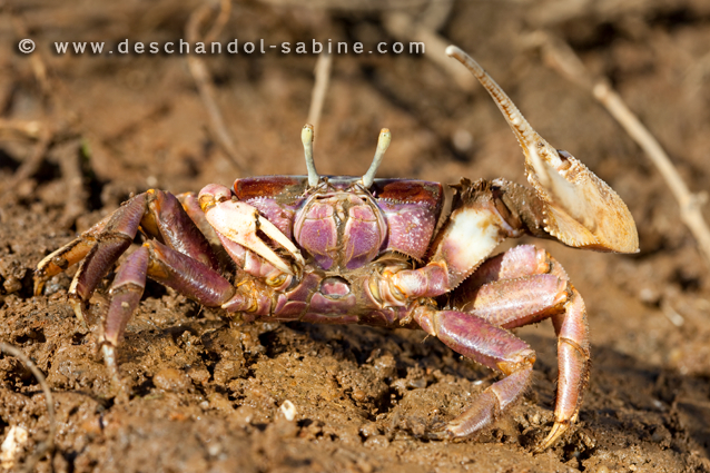 : Crabe violoniste (Uca tangeri), mâle, Marisma del Odiel, Huelva, Espagne.