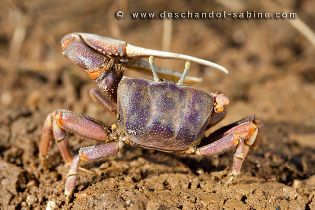 : Crabe violoniste (Uca tangeri), mâle, Marisma del Odiel, Huelva, Espagne.