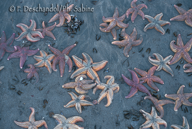 : Etoiles de mer (Asterias rubens), invasion, plage d'Octeville (76), France.