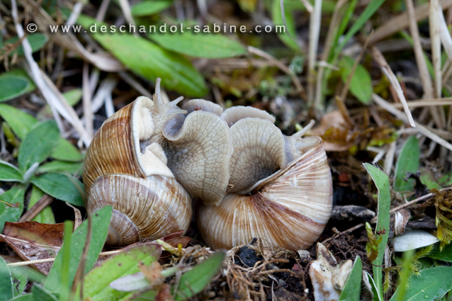 : Escargots de Bourgogne (Helix pomatia), accouplement, Heudreville (27), France.