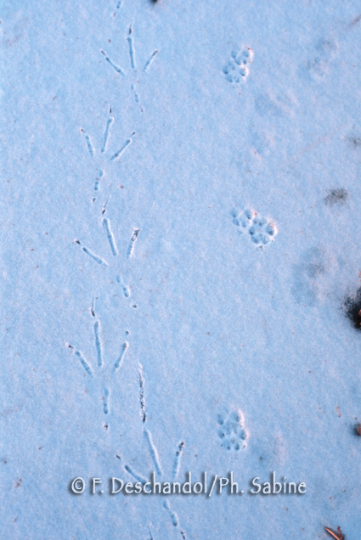 : Butor étoilé (Botaurus stellaris) et Renard roux, traces dans la neige, Baie de Seine (76), France.