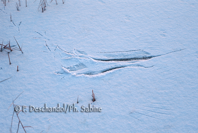 : Butor étoilé (Botaurus stellaris), traces dans la neige, Baie de Seine (76), France.