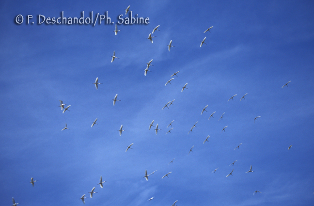 : Spatules blanches (Platalea leucorodia), en vol, Marismas del Odiel, Huelva, Espagne.