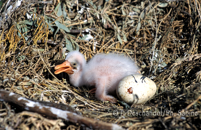 : Spatule blanche (Platalea leucorodia), poussin au nid et oeuf, Marismas del Odiel, Huleva, Espagne.