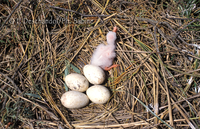 : Spatule blanche (Platalea leucorodia), nid, oeufs et jeune, Marismas del Odiel, Huelva, Espagne.