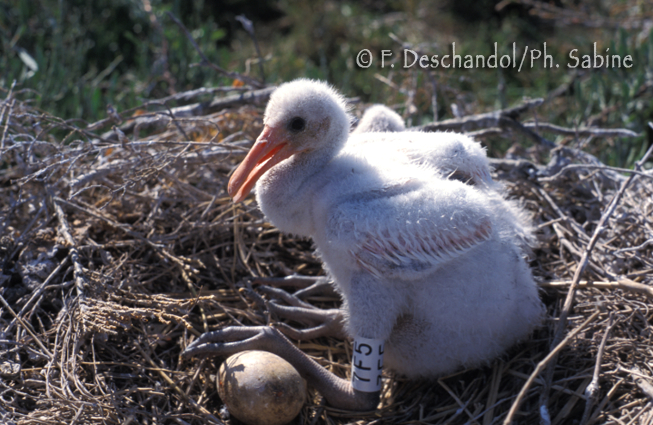 : Spatule blanche (Platalea leucorodia), poussin au nid bagué et oeuf, Marismas del Odiel, Huleva, Espagne.
