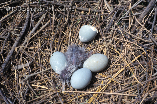 : Héron cendré (Ardea cinerea), nid et oeufs et poussin, Marismas del Odiel, Huelva, Espagne.