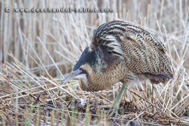 : Butor étoilé (Botaurus stellaris), mâle en train de chanter, Baie de Seine (76), France.