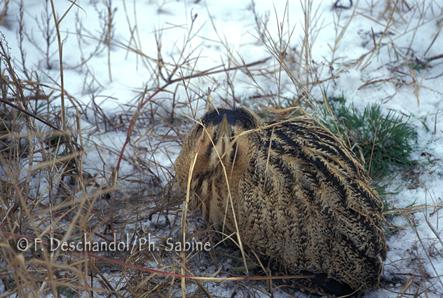 : Butor étoilé (Botaurus stellaris), attitude de menace, Baie de Seine (76), France.