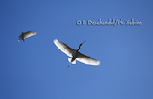 Spatule blanche (Platalea leucorodia) et Héron Garde-boeufs, en vol, Marismas del Odiel, Huelva, Espagne.