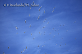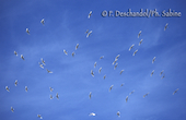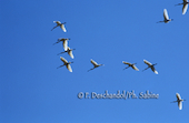 Spatules blanches (Platalea leucorodia), en vol, Marismas del Odiel, Huelva, Espagne.