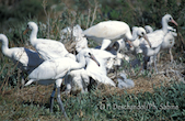 Spatules blanches (Platalea leucorodia), jeunes non volants, Marismas del Odiel, Huelva, Espagne.