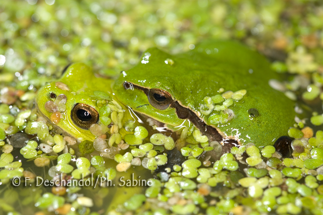 : Rainettes vertes (Hyla arborea arborea), amplexus, Marais Vernier (76), France.