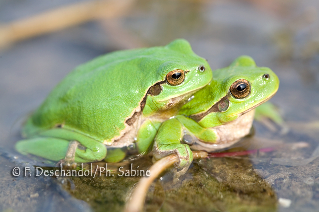 : Rainettes vertes (Hyla arborea arborea), amplexus, Marais Vernier (76), France.