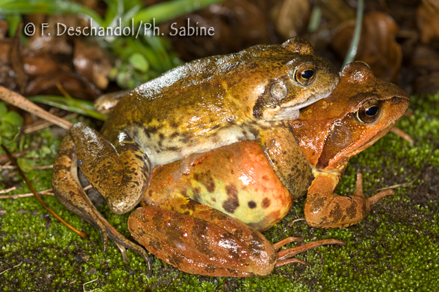 : Grenouilles rousses (Rana temporaria parvipalmata), amplexus, Rio Tendi, Espagne.