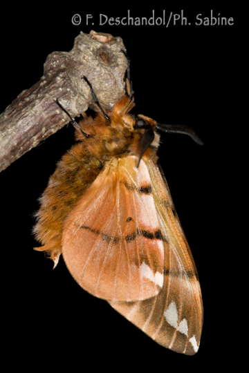 : Bombyx versicolore (Endromis versicolora), mâle après éclosion, Bitovany, République Tchèque.