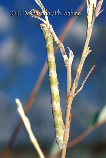 : Géomètre du Bouleau (Biston betularia), chenille, Baie de Seine (76), France.