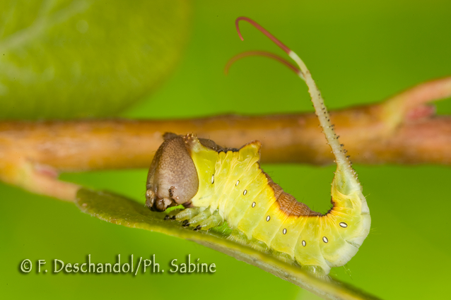 : Grande queue fourchue (Cerura vinula), chenille 4ème stade après la mue, attitude d'intimidation, Baie de Seine (76), France.