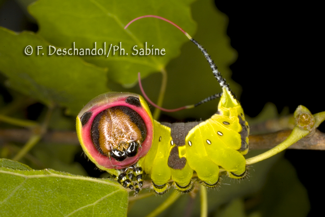 : Grande queue fourchue (Cerura vinula), chenille 5ème stade, attitude d'intimidation, Baie de Seine (76), France.