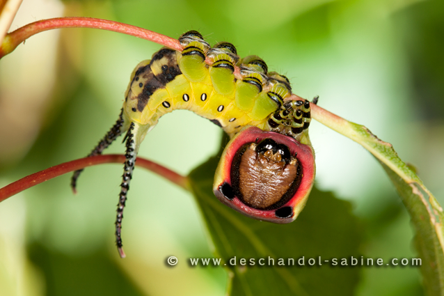 : Grande queue fourchue (Cerura vinula), chenille 5ème stade, attitude d'intimidation, Le Havre (76), France.
