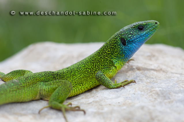 : Lézard vert occidental (Lacerta bilineata), mâle, Istrie, Croatie.