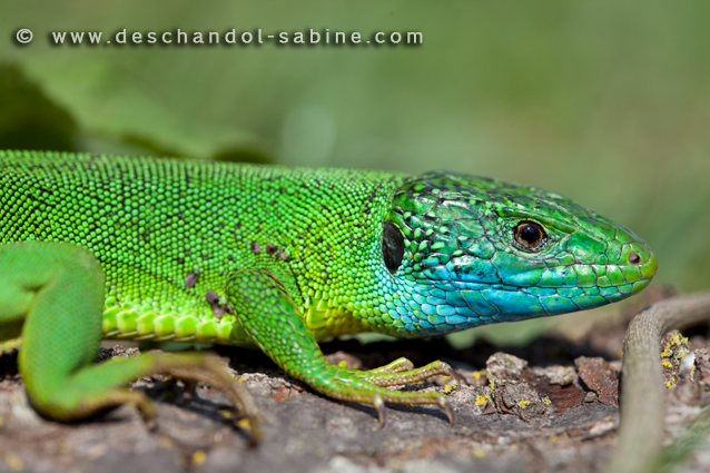 : Lézard vert occidental (Lacerta bilineata), mâle, Muzzana del Turgnano, Italie.