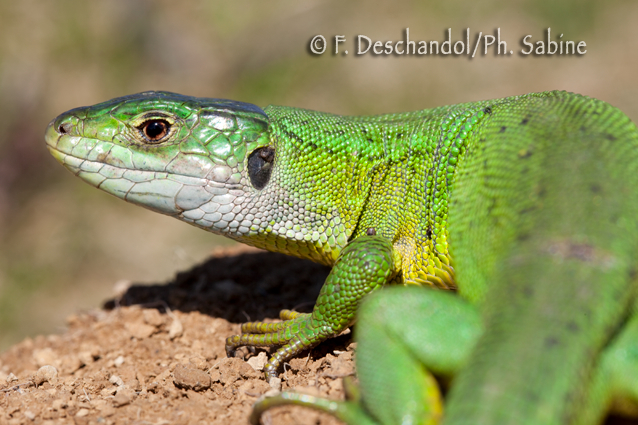 : Lézard vert occidental (Lacerta bilineata), femelle, Larrau (64), France.