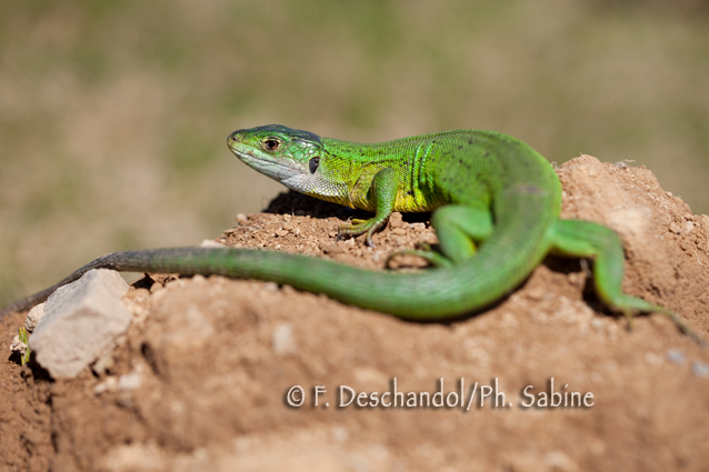 : Lézard vert occidental (Lacerta bilineata), femelle, Larrau (64), France.