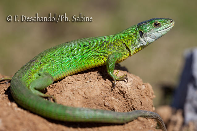 : Lézard vert occidental (Lacerta bilineata), femelle, Larrau (64), France.