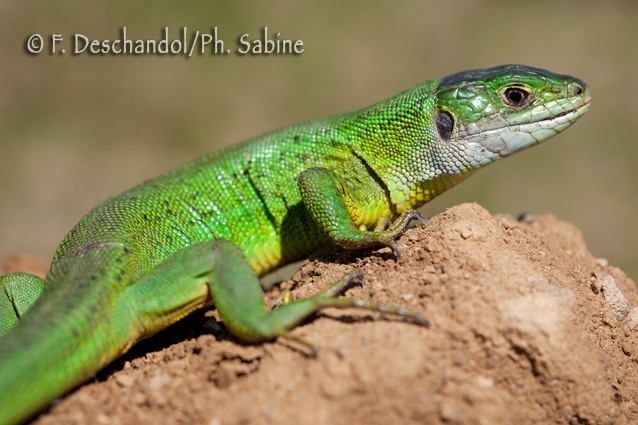 : Lézard vert occidental (Lacerta bilineata), femelle, Larrau (64), France.